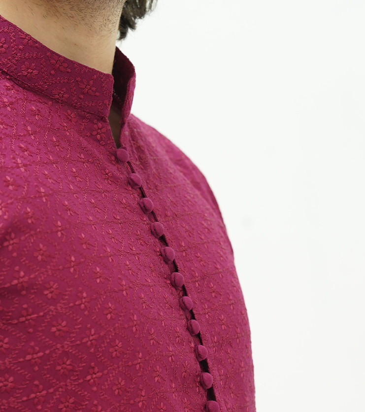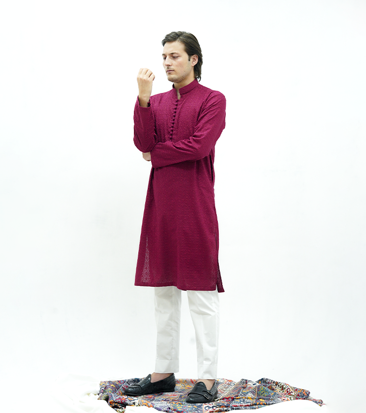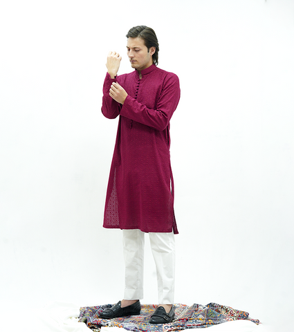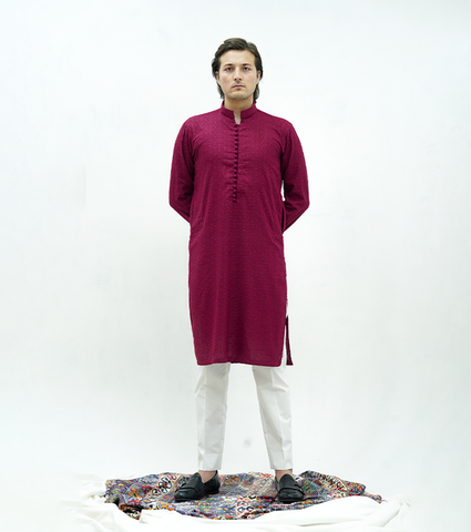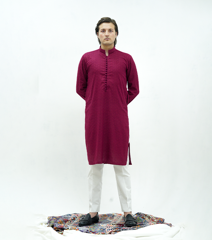 Product Description: Rich and refined, this berry wine kurta from the Elevated Kurta Series is crafted in premium cotton lawn with subtle self embroidered texture.The deep, elegant hue is complemented by same-fabric loop buttons that add a handcrafted, traditional touch. Designed with a classic straight band collar, round sleeves, and a clean straight hem, it offers a polished silhouette with breathable comfort. Finished with functional side pockets, this kurta is ideal for festive occasions, formal gatherings, and elevated ethnic wear.