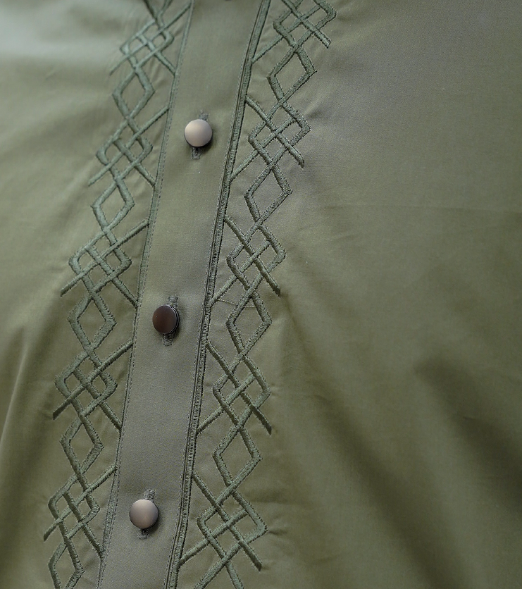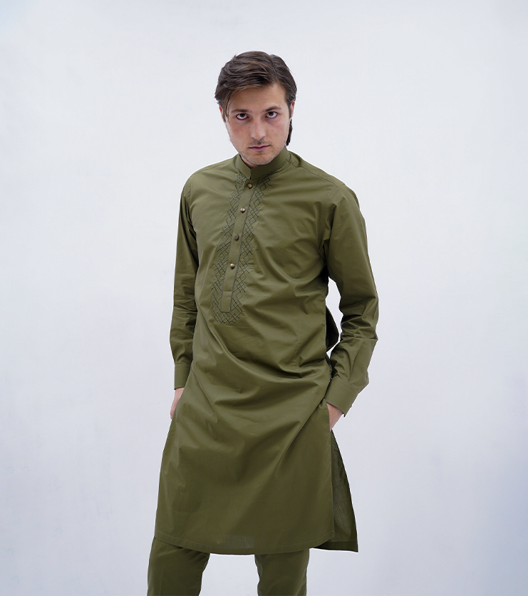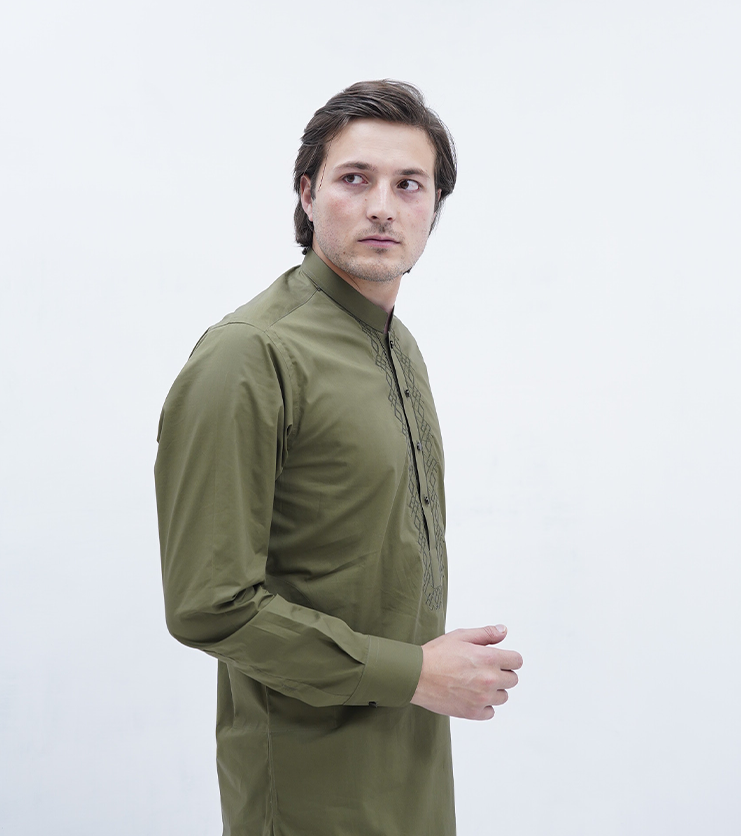 Product Description: Refined and contemporary, this olive green kurta pants set from the Limited Edition Collection is designed for effortless elegance.Crafted from premium imported Egyptian cotton, it features intricate embroidery detailing along the front placket, adding depth and a subtle statement to the clean silhouette. The fabric offers a smooth fall with a silky feel and a crisp finish that remains easy to maintain. Styled with a classic straight band collar, exposed buttons, angled cuffs, and a straight hem, the kurta is paired with tailored pants featuring a back elastic waistband and turn-up bottom—making it ideal for festive occasions, formal gatherings, and elevated day-to-evening wear.