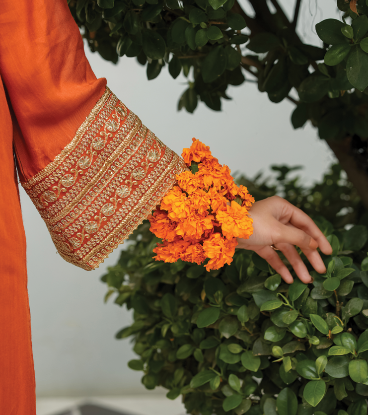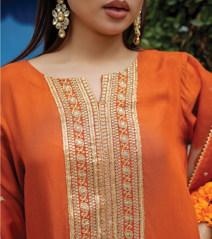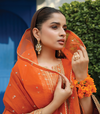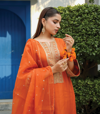 The look is completed with a sheer organza silk dupatta, adding a graceful and festive touch perfect for special occasions and refined gatherings.